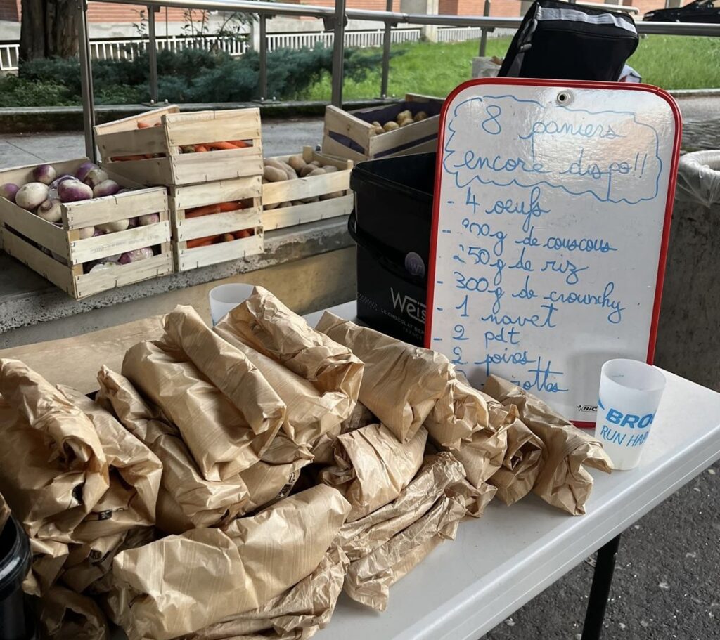 Le tout est assemblé sur place, à partir de produits livrés en circuit court, souvent en vrac. Une attention particulière est portée à la qualité et à l’impact environnemental, sans compromis sur l’accessibilité : les paniers, achetés bien plus cher par l’association, sont revendus à seulement quelques euros aux étudiants.